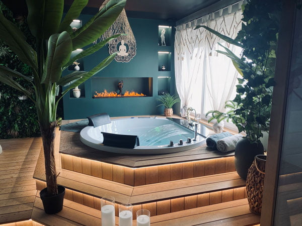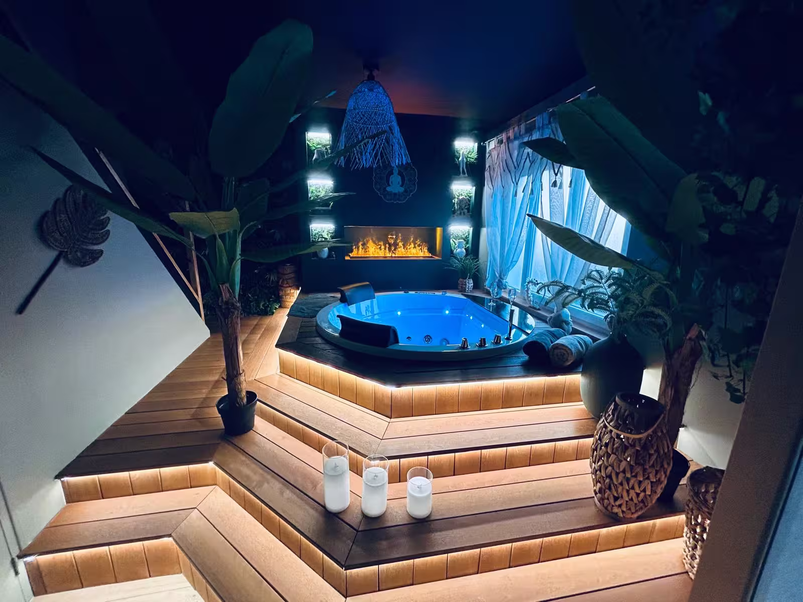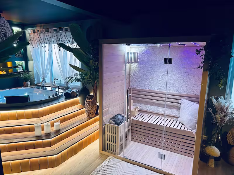 Offrez-vous des moments de relaxation totale avec le sauna traditionnel à vapeur, parfait pour un moment à deux, et la douche sensorielle innovante avec ses trois programmes pour une expérience revitalisante. La baignoire balnéo ronde, encastrée dans le sol, est parfaite pour des moments de détente absolue, tout en profitant de l’ambiance tropicale environnante. La cheminée à vapeur d’eau ajoute une touche de chaleur et d’élégance, idéale pour créer une atmosphère cosy et romantique.